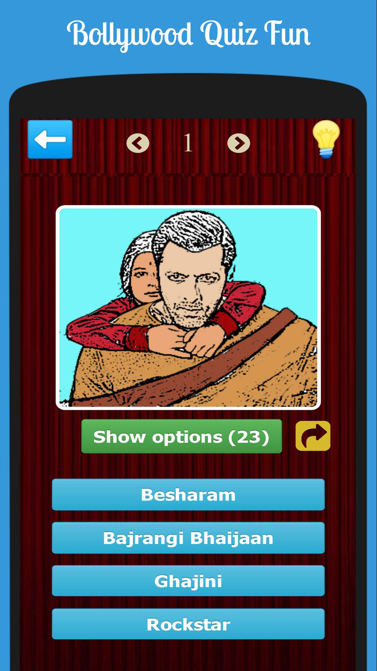 In the Guess by picture category, you need to guess the Bollywood Movie based on the Movie still /actor/actress shown to you. An artistic movie still images and lots of puzzles are waiting, Install the app now and have fun.