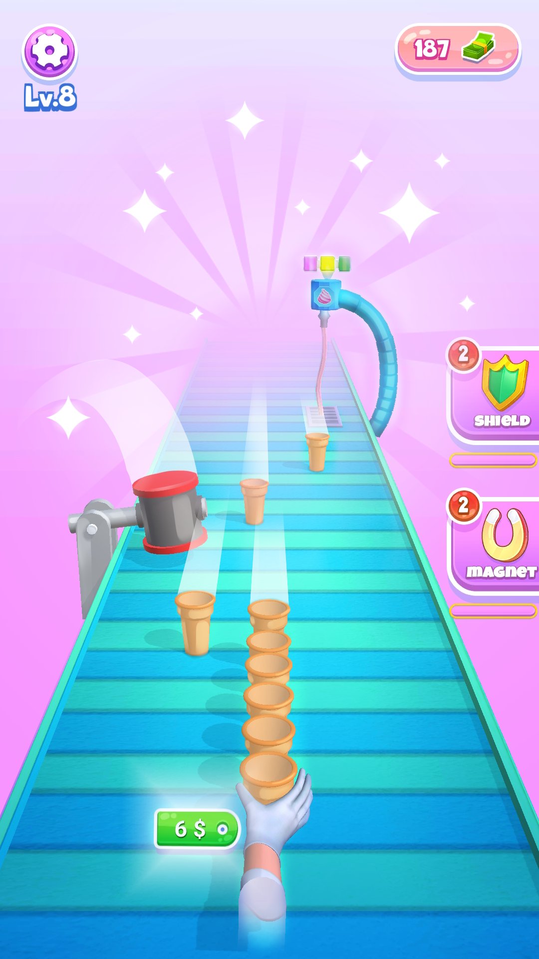 Ice cream stack — это гипер-казуальная игра, в которой вам предоставляются рожки, которые движутся на конвейерной ленте, и вы должны наполнить их сливками или мороженым и вишнями. Но убедитесь, что есть несколько резаков и других препятствий, с которыми вам нужно быть осторожным. . Приготовьте лучший замороженный десерт для своего клиента и в конце узнайте свой уровень.