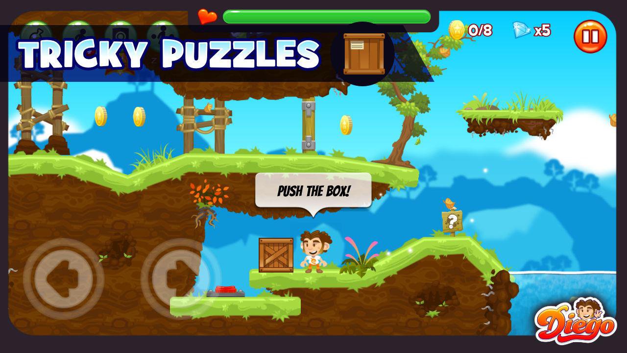 Диего - вызов, прокрутка классической игровой платформы с большим количеством интересных функций. Выбор между двумя персонажами, играть, как мальчик или девочка. Перейти между препятствиями, победить всех монстров и попытаться собрать как можно больше монет и кристаллов, как это возможно!