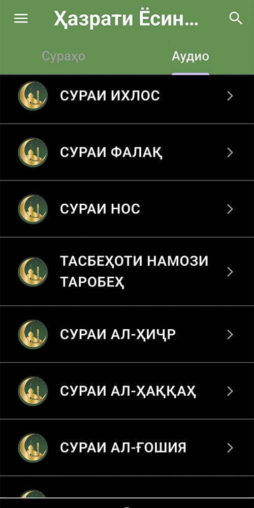 Вот информация о мобильном приложении «Ҳазрати Ёсину Таборак», которое предоставляет тексты и аудио чтения на таджикском языке — в приложении входят суры Йасин, Таборак (Аль-Мумин), а также другие небольшие суры (Амма и другие)