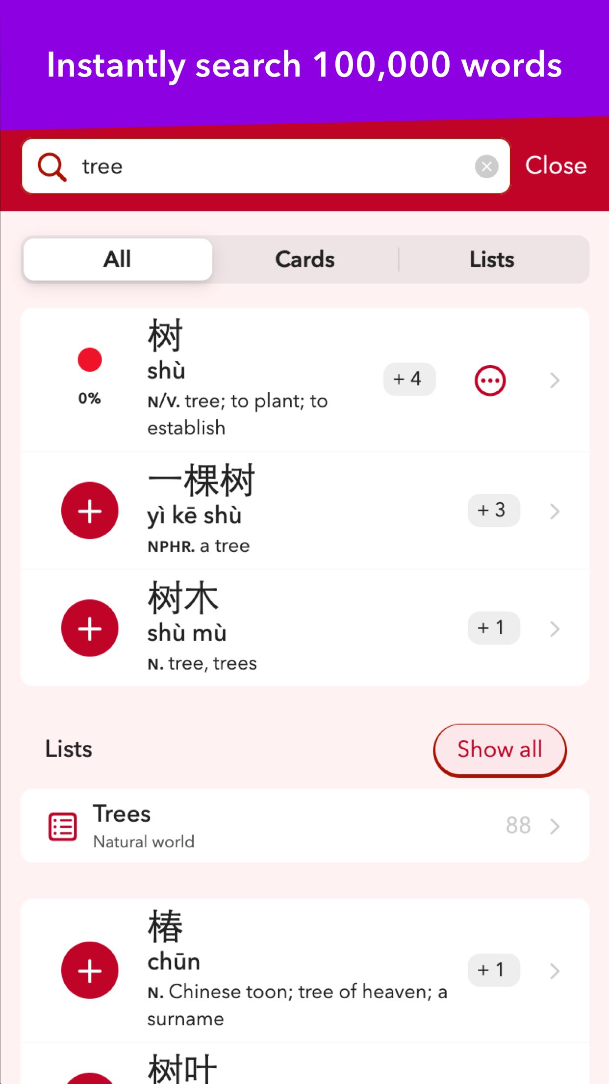 ★ trainchinese отлично подходит для учебы! Наши слова организованы в более чем 1 000 словарных списков и охватывают темы от самых простых повседневных диалогов до международных отношений. Вы думаете, чего-то все равно не хватает? Пользователи всегда могут связаться с нами и попросить список слов по теме, которая интересна лично им. Мы будем рады помочь!