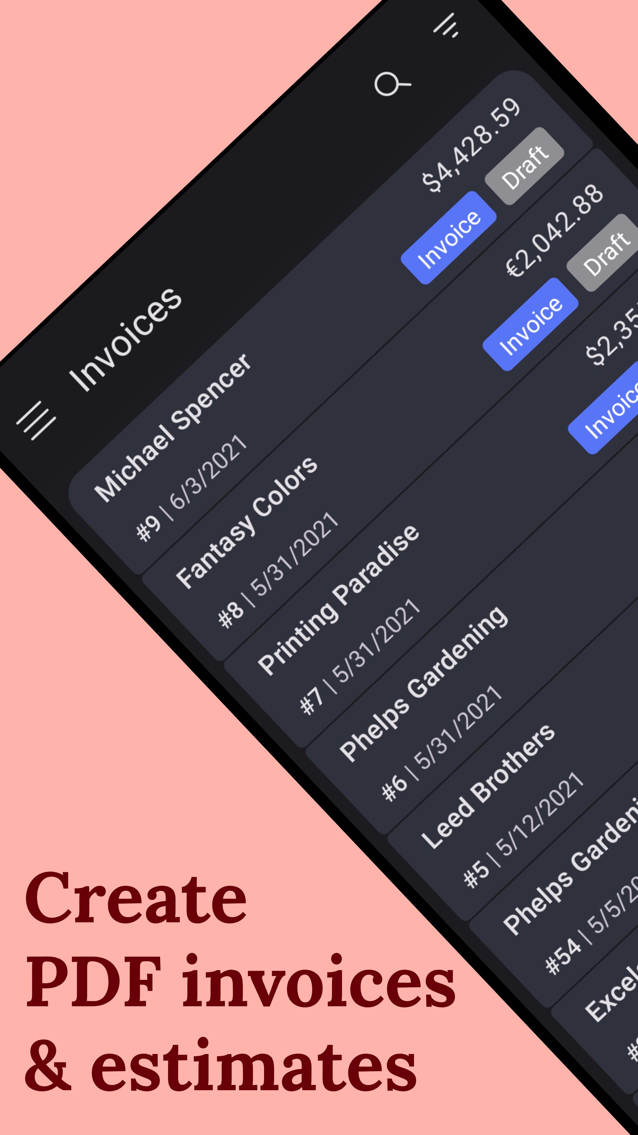 • Быстро создавайте счета, расценки и сметы в формате PDF и отправляйте их своим клиентам.