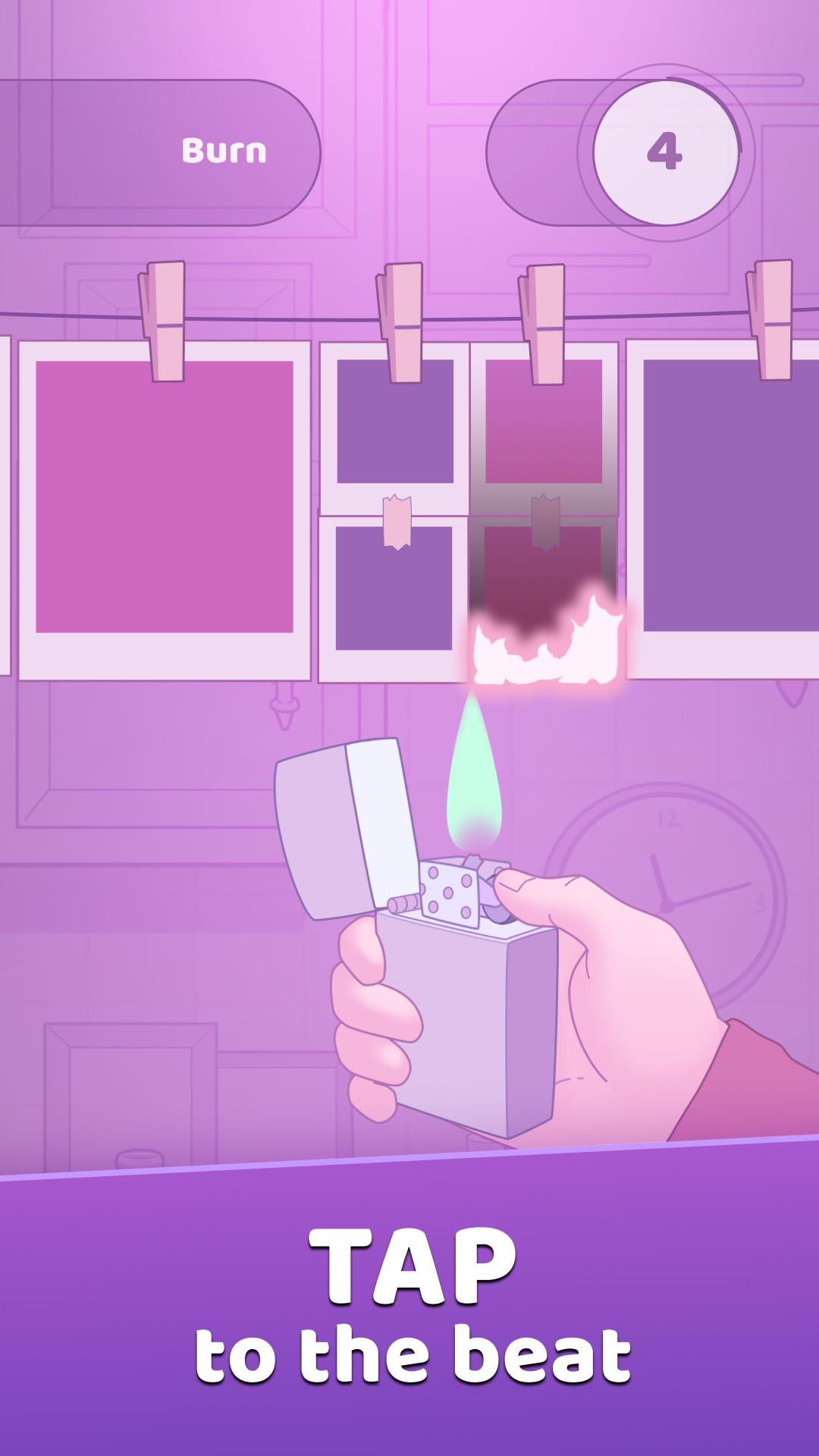 - Увлекательная ритм-игра с необычным и захватывающим геймплеем — сжигайте фотографии зажигалкой в такт.