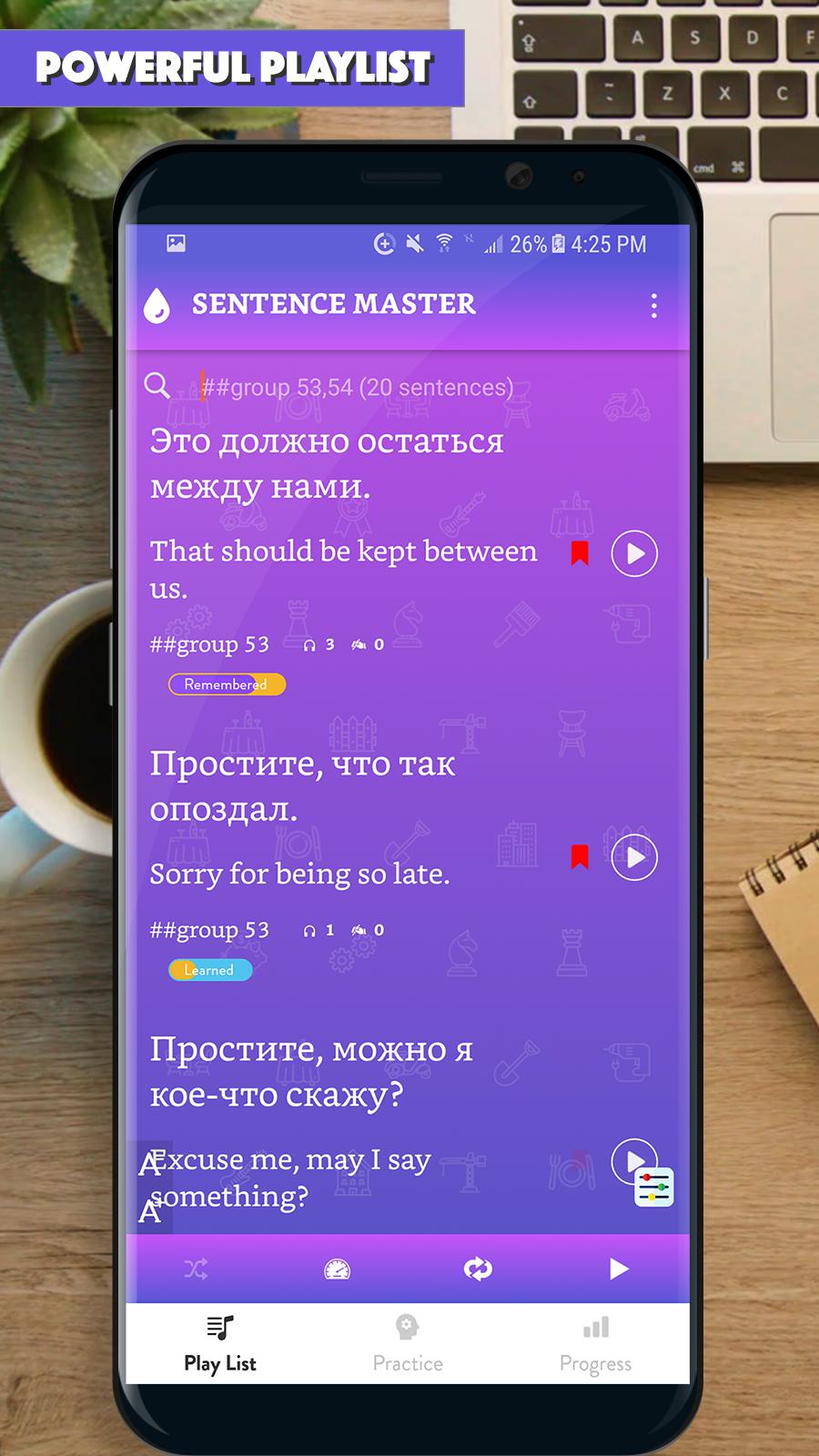 Приложение предоставило вам тысячи общих предложений, используемых в повседневной жизни, со звуком для каждого предложения.