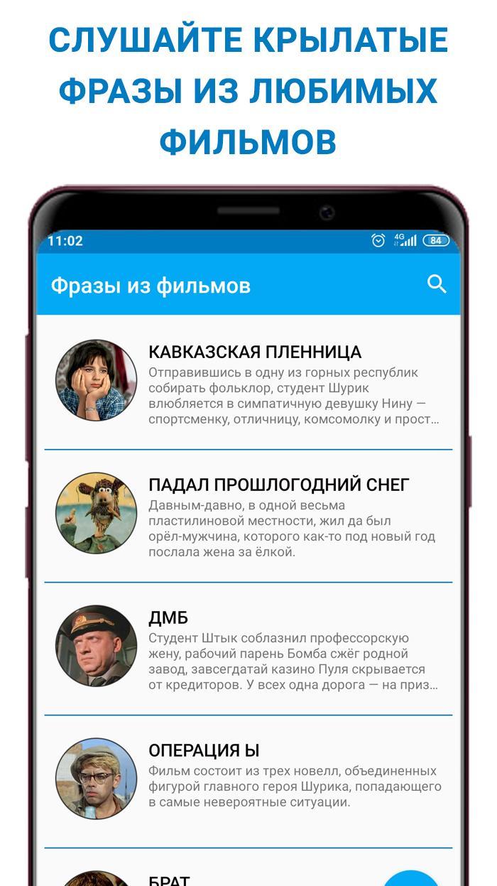 Сегодня существует множество приложений, задача которых помогать пользователю с пользой проводить время. Иногда это игры, или программы, помогающие в обыденной жизни. Но встречаются и программы, задача которых заключается во второстепенной роли. "Фразы из советских фильмов" - это то, что подходит для любого поколения.