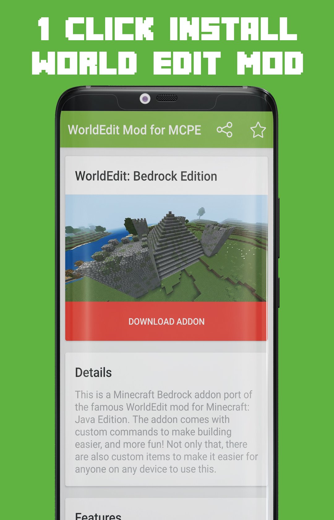 WorldEdit Mod для Minecraft PE — это приложение, позволяющее легко загрузить и установить дополнение WorldEdit: Bedrock Edition к игре Minecraft Pocket Edition на ваших устройствах Android. Благодаря нашему установщику в один клик, который упрощает установку модов, дополнений, карт, скинов и пакетов текстур Minecraft.