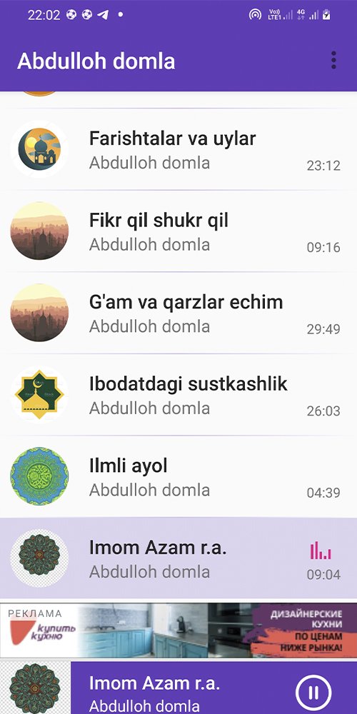 Абдулло домла — бу таникли исломи воиз ва устоз Абдулло домланинг марузаларини тинглаш, исломий билимларни ошириш ва кундалик хаёт учун фойдали насихатлар олишга молджалланган кулай мобил илова.