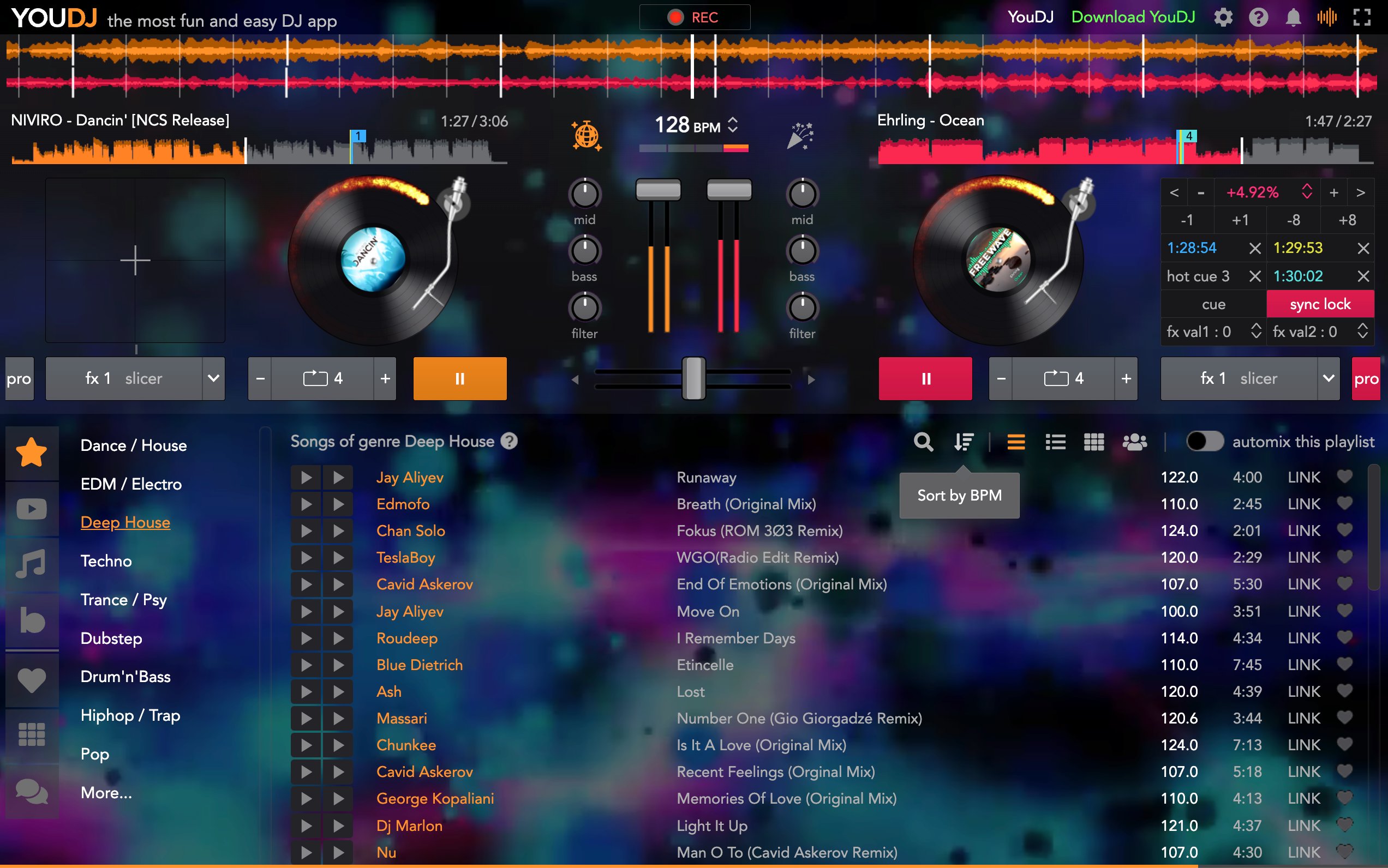 YouDJ — самая простая программа для диджеев. Смешивайте музыку как профессиональный ди-джей, даже если это ваш первый раз! Вам также не нужна музыка, YouDJ также поставляется с отличными песнями. Кроме того, это в основном бесплатно и без рекламы!
