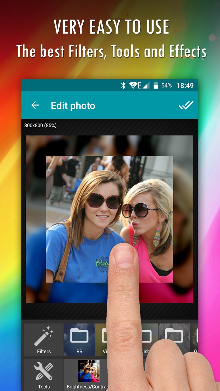 После этого вы попадаете на экран редактирования. Применить все эффекты, которые вы хотите, выбирая из галереи "Стандартные фильтры" или с помощью "Инструментов" (яркость, контраст, насыщенность, текст, границы, ...), для создать собственные эффекты.