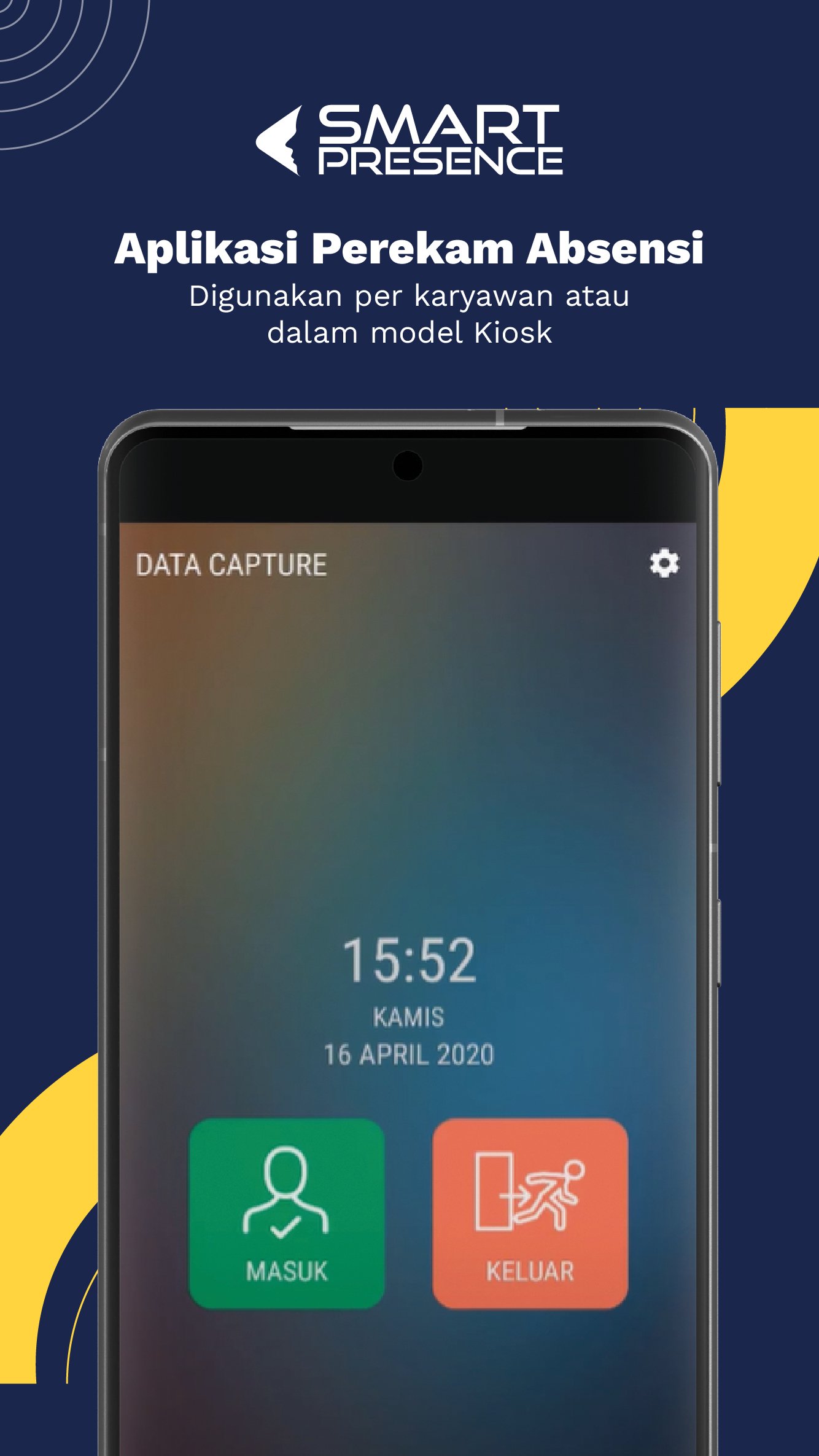С помощью SmartPresence DataCapture (сотруднику) будет легко делать запись посещаемости (синхронизацию) через устройство, которое используется отдельно или в форме использования вместе с концепцией KiosK. SmartPresence datacapture имеет собственную процедуру регистрации с функциями защиты от мошенничества. Эта функция обеспечит защиту от мошенничества, когда кто-то хочет подделать свое лицо для своих друзей.