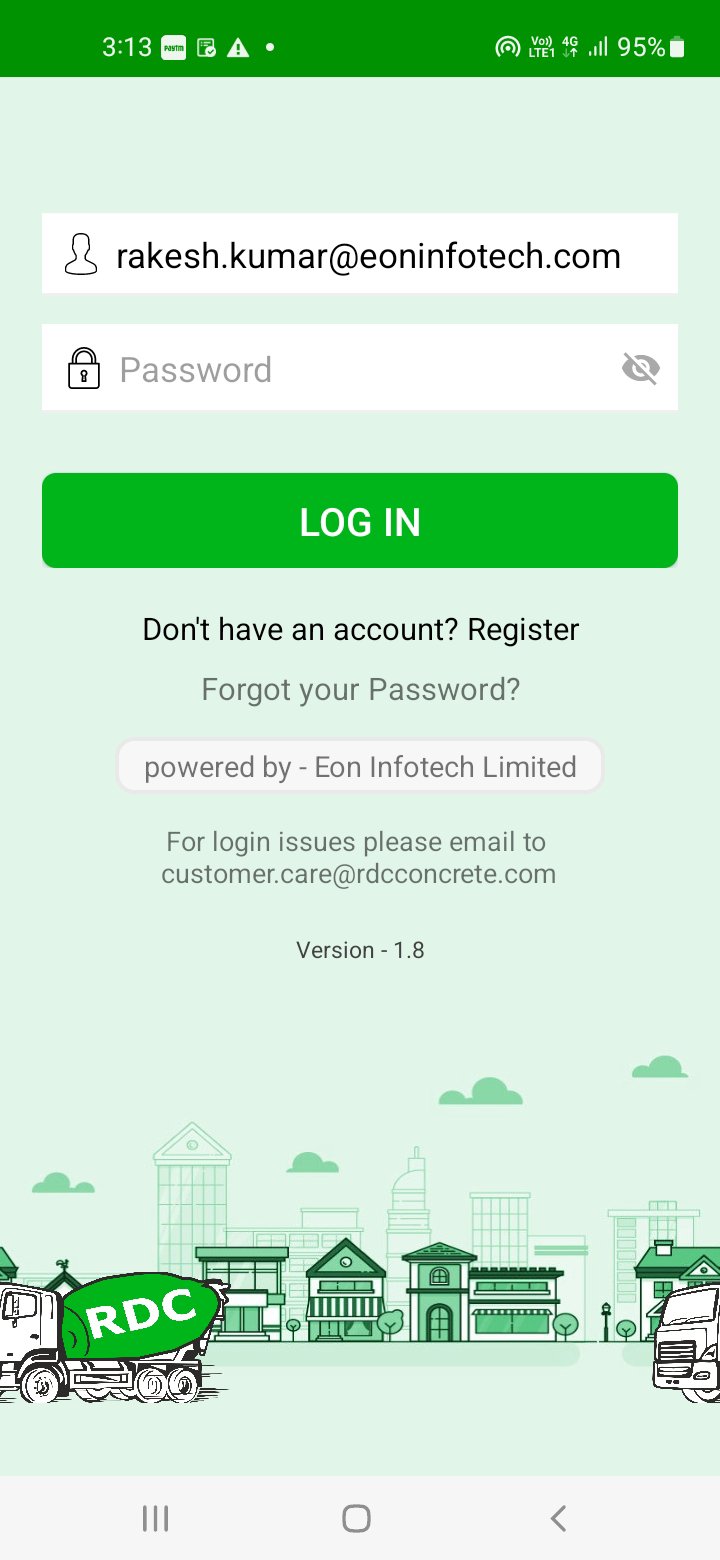 RDC Concrete (India) Pvt Ltd производит и поставляет готовую бетонную смесь (RMC) своим клиентам, которые в основном включают строительные компании, застройщиков, подрядчиков, инфраструктурные компании, промышленные проекты (цемент, сталь, электростанции и т. Д.), Коммерческие проекты. и частные лица. Это приложение позволяет новым и существующим клиентам размещать онлайн-заказ на поставку бетона и отслеживать статус заказа.