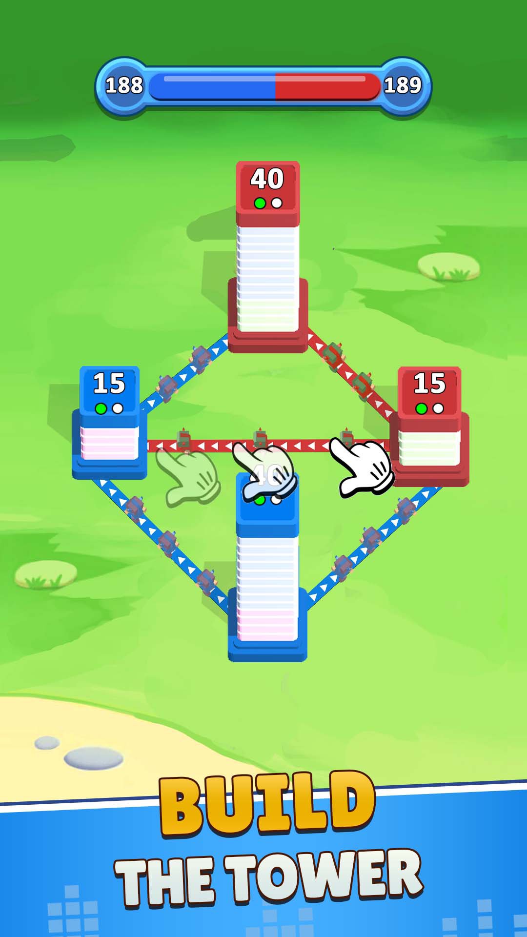 - Проведите пальцем, чтобы провести линию от вашей башни к другим с целевым зданием и увеличить количество солдат.