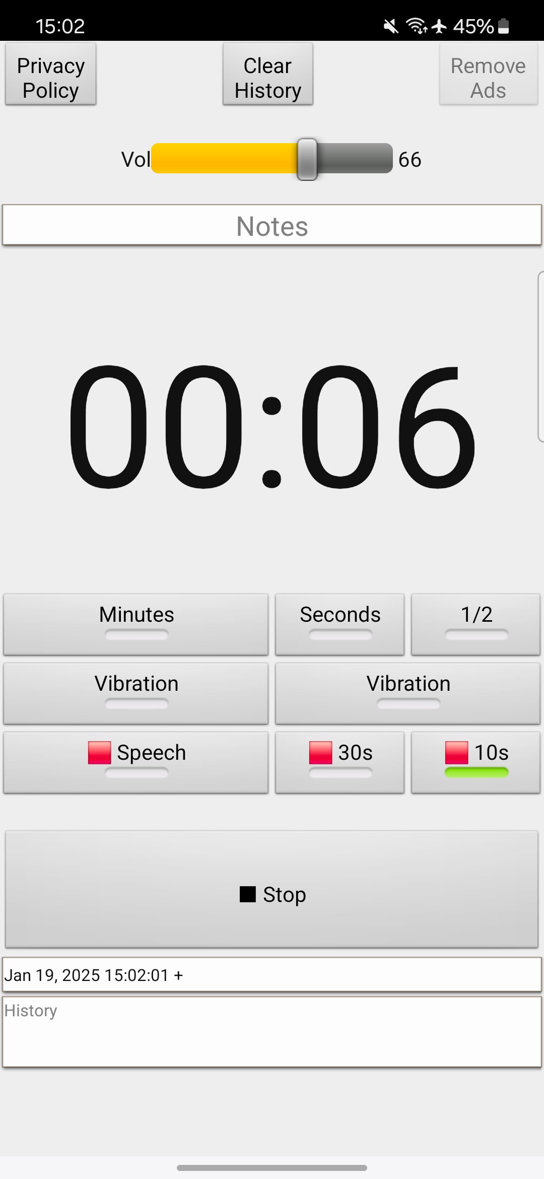 Простое и удобное приложение для интервального таймера, которое уведомляет вас вибрацией и звуковым сигналом каждую минуту и секунду. Голосовое уведомление каждую минуту и каждые 10 секунд (только поддерживаемые устройства). Для 1-минутной диеты, теста Клеперина и т. д.