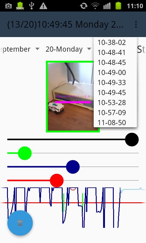 Видеопоследовательности хранятся на диске устройства. Можно настроить максимальный объем хранилища (по умолчанию 200 МБ). Когда место отсутствует, старые последовательности автоматически уничтожаются. Синяя закругленная кнопка позволяет уничтожить текущее выбранное видео и, при необходимости, все видео текущего выбранного дня.