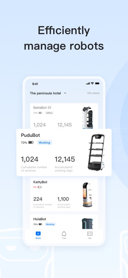 全新的普渡机器人管理应用,高效管理普渡机器人,一键呼叫,实时获悉机器状态