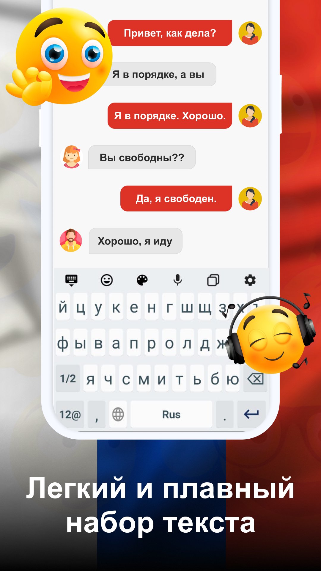 • Удобная русская клавиатура включает новые эмодзи, символы и стили текста.