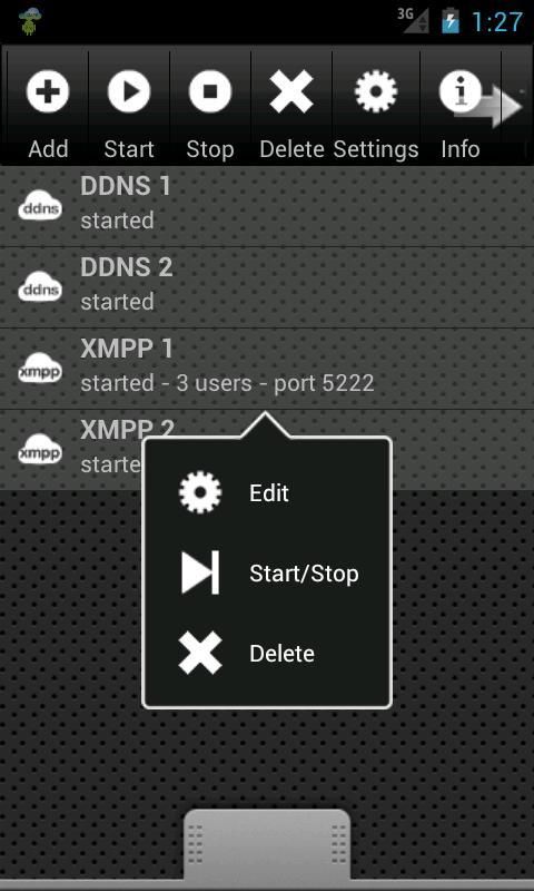 In this version you can add two servers (XMPP Server or Dynamic DNS Updaters) and optionally three users. If you want to be able to add unlimited items please buy XMPP Server Pro. If you buy the pro version you will support development, will be able to add unlimited items and see no advertisements!