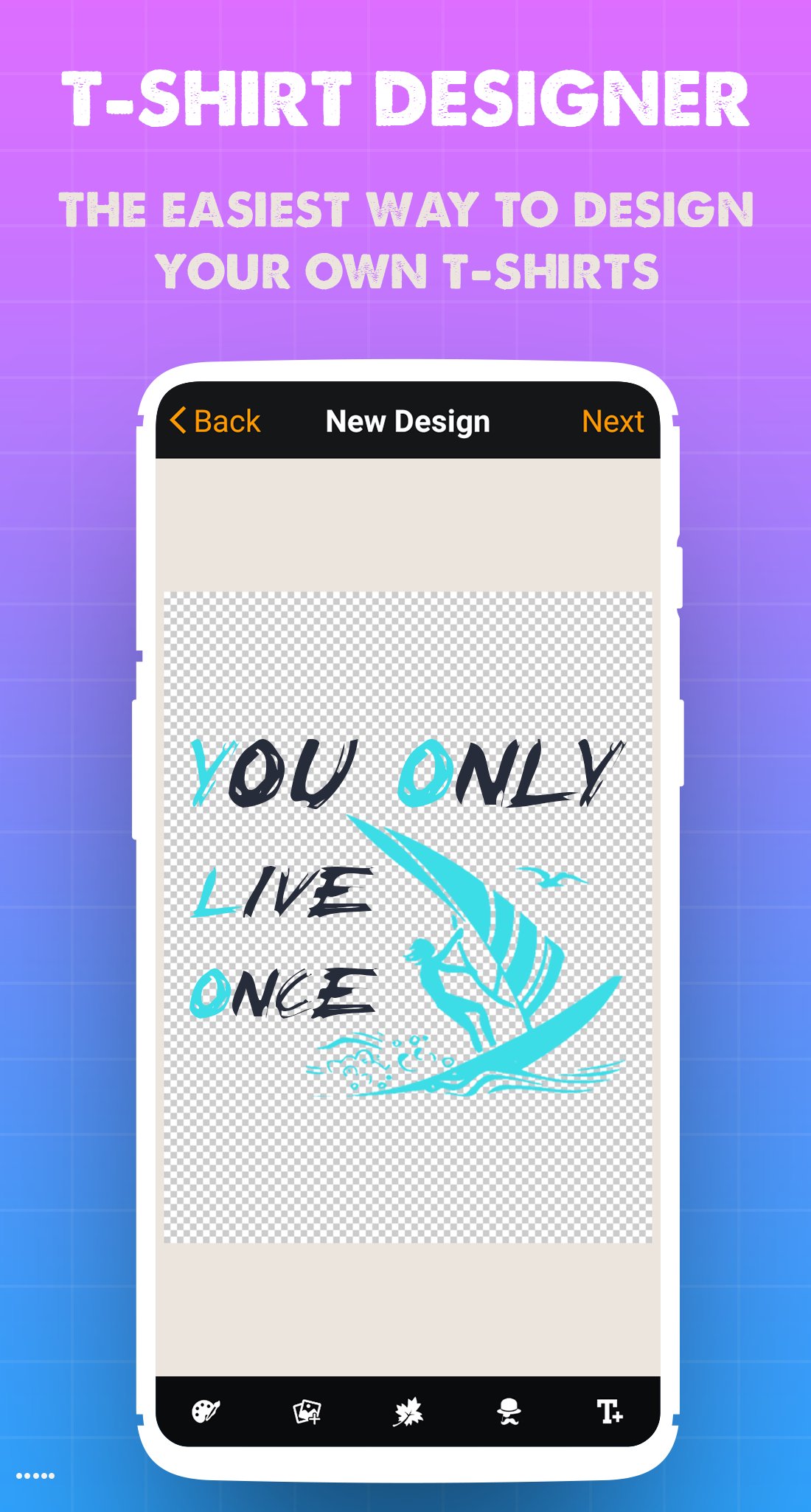 Design your T-shirt with images from your gallery, texts or preset images.