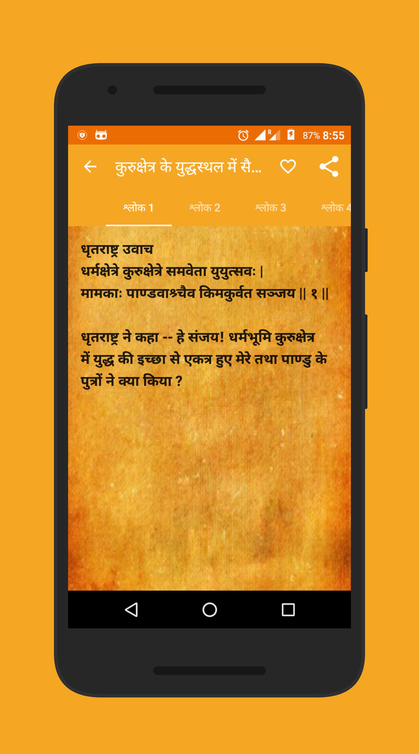 • Share feature to easily send your favorite Bhagavad Gita shloka / verse to your friends