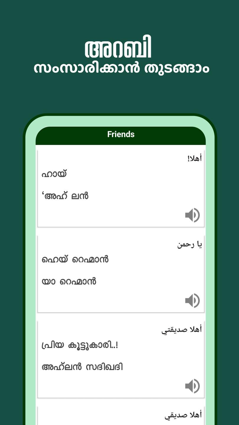 Speaking in Arabic is both a fashion and a necessity in Arabic nations. The app primarily attempts to introduce those who speak Malayalam language. Every Malayalam native speaker can learn Arabic through this app “Spoken Arabic Malayalam 360”. The app adopts the scientific approach, introducing Arabic alphabets, words, and sentences in that order and application of these in the most common situations of daily life. This app can also be helpful to people who are on visit to Arabic nations as tourists, employees, and businesspersons. It is designed to help Malayalam speakers learn Arabic by using Arabic audio and Malayalam phrases. Learning process is quite simple with this app, users can tap on speaker icon to hear the pronunciation of Arabic words. The app follows a predefined structure for translating Arabic to Malayalam.