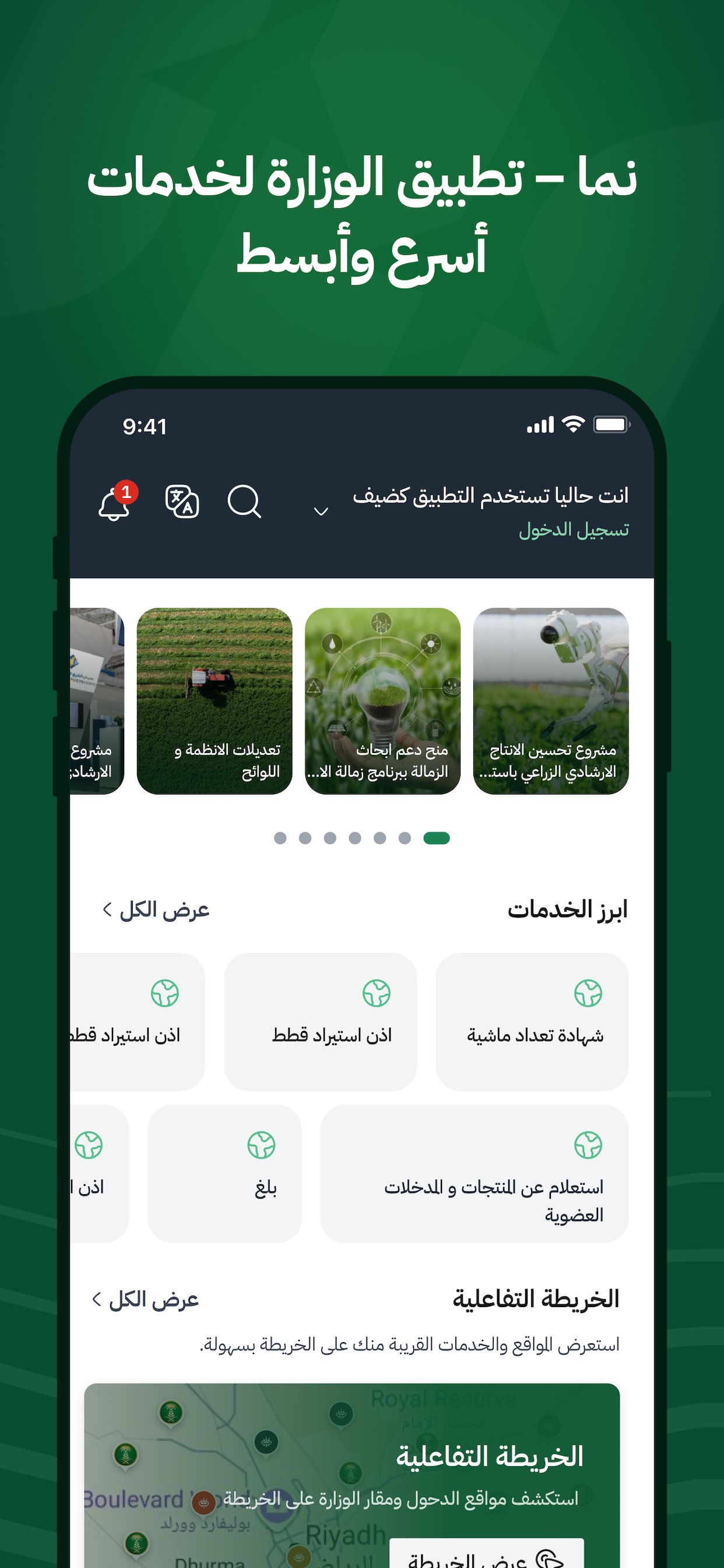 The Ministry of Environment, Water and Agriculture app includes services such as organic products and inputs, events, agricultural products, water, agriculture and livestock reports, scheduling appointments to visit the ministry headquarters and its branches, and much more. It also provides a service directory for seven sectors: water, agriculture, livestock, environment, fisheries, land and area, and public services for individuals, the business sector, government agencies, visitors to the Kingdom, and voluntary associations.