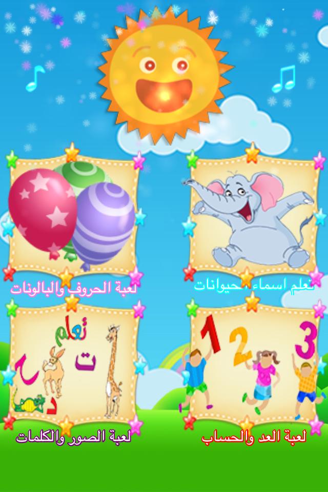 البرنامج يعلم الاطفال الالوان والاحرف العربيه ؛ اسماء الحيوانات والفواكه .