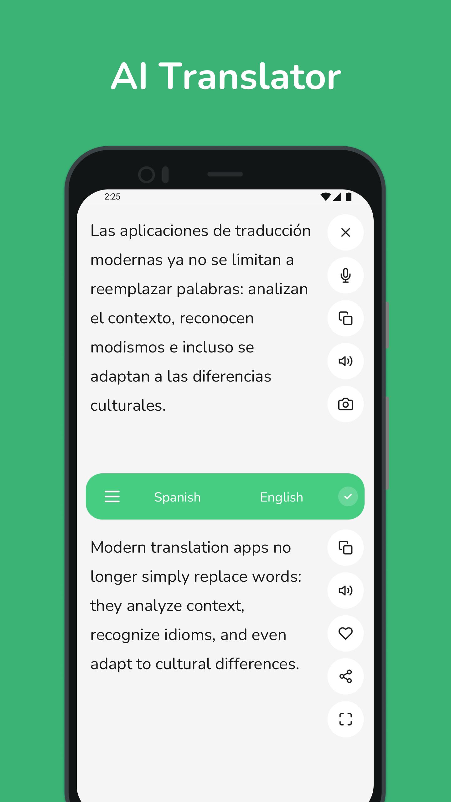 • Instant Translation: Get fast and precise translations from Spanish to English and vice versa, perfect for everyday use.