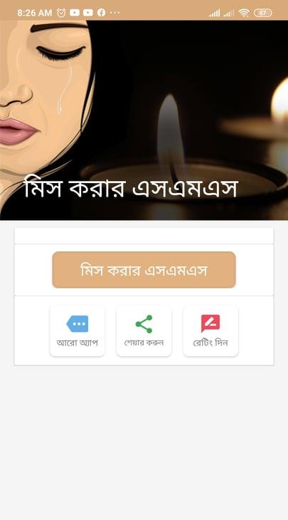 In this “miss korar sms 2022” app is the lots of New Collection of “miss you status” and its completely free. You can send eaisly SMS to your favorite person. It is very easy to use. Just click share button. You can also read the app in offline mode without any problem.