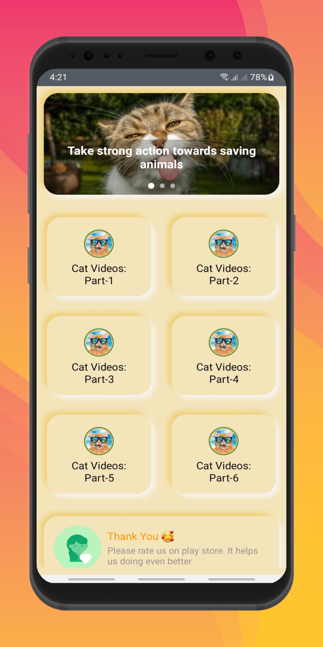 In this application, we divided different parts of cat videos. We hope you enjoy our cat video collection. Every update we add more and more cat videos for our cat lovers.