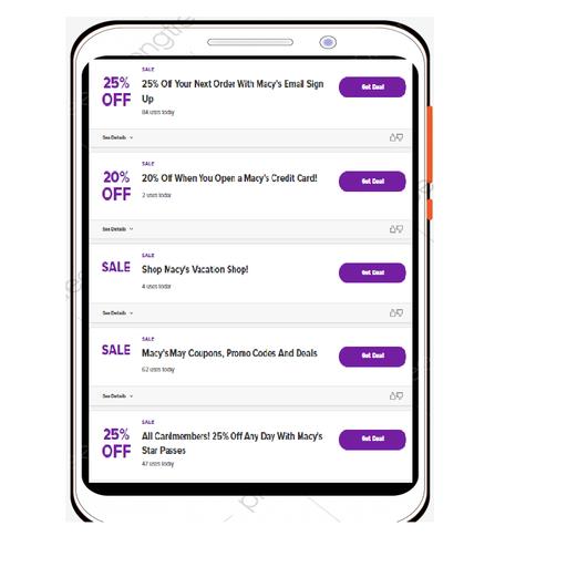 This app has it all for you A useful app where you will find many Coupons For macy's. Check out coupon for macy's digital coupons before you go shopping. This will help you save much more with discounts and great deals. Save your time and efforts in searching for specials discounts, deals, promos codes or digital coupons for macy's in many sources