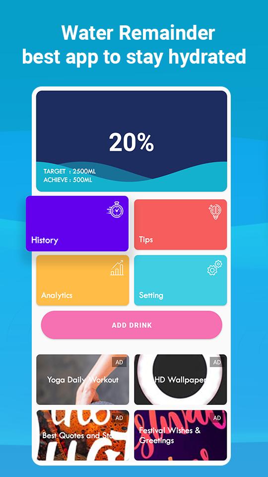 This Water Reminder App will help you to remember to Drink Water at regular intervals and keep yourself hydrated! Track your Recommended Water Intake habits and increase it with the help of notifications from this Water Tracker: Water Drinking Reminder App!
