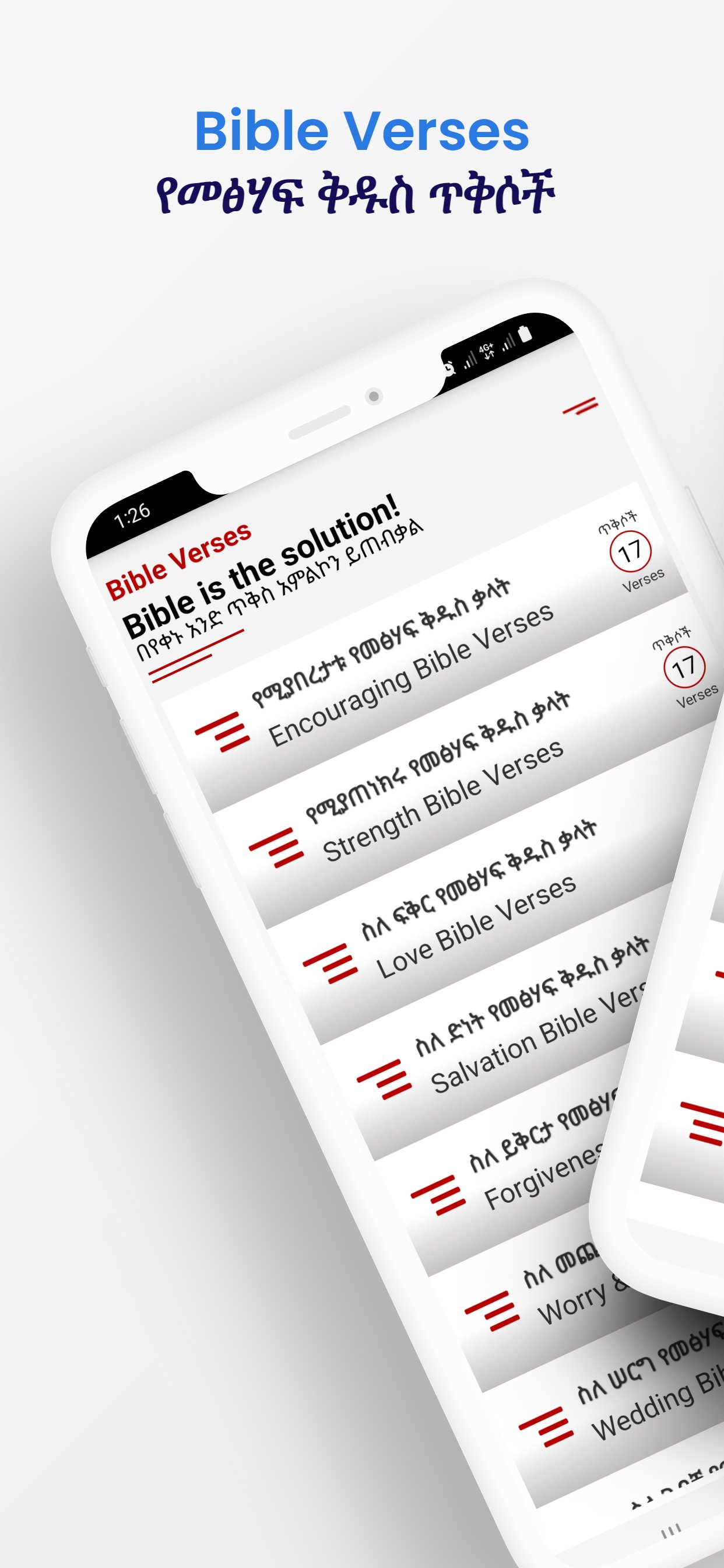 In this App there are over 500 Verses, Quotes, Proverbs … which are from different parts of the Bible, this will help us to read only parts of Bible we want to read about. And this App is in both in Amharic (Ethiopian Language) and in English.
