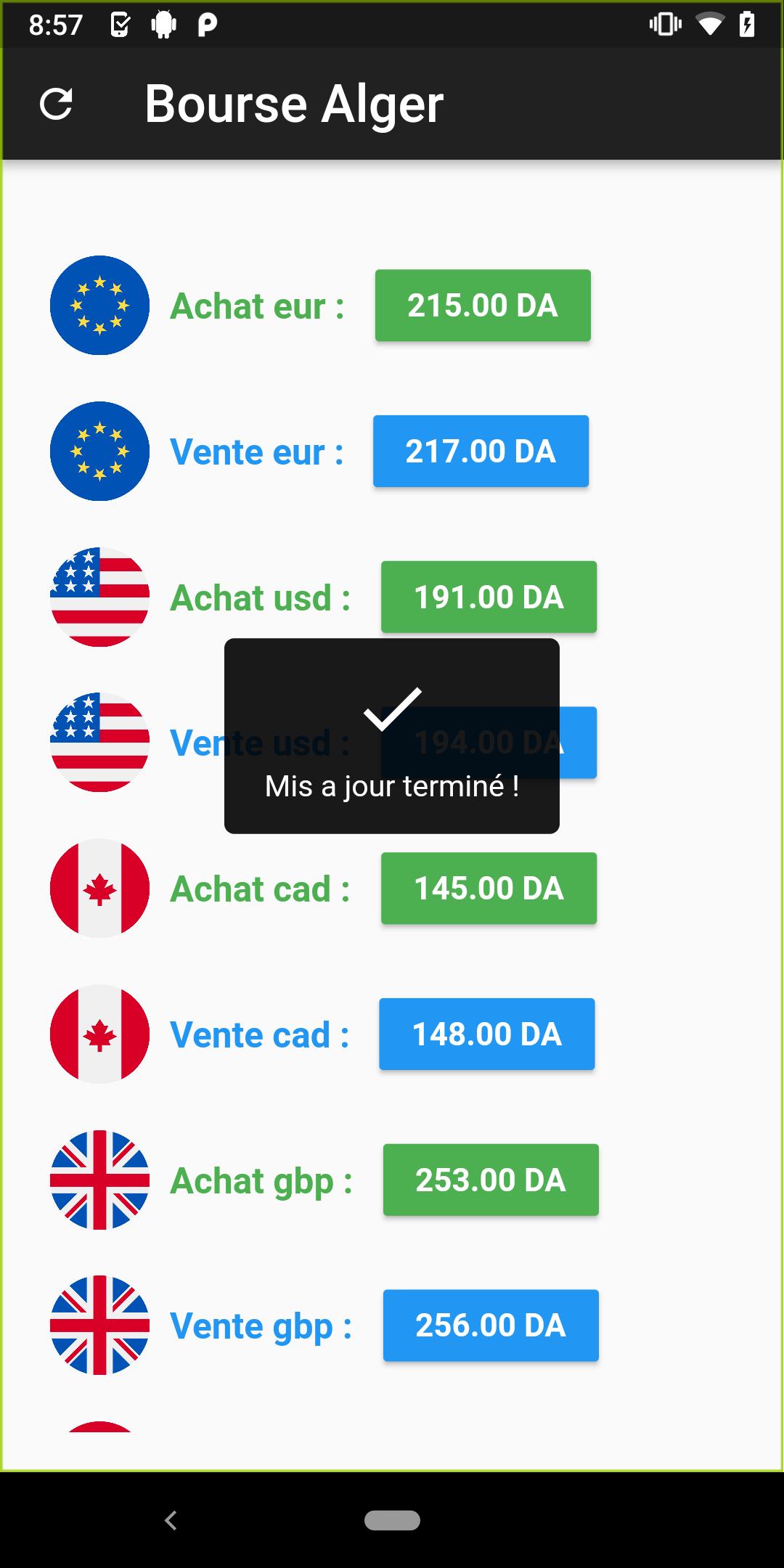 Bourse alger is a Mobile Application that collects currency exchange rate information US Dollar ($), Euro (€), Pound (£), and the Canadian dollar (C $) against the Algerian dinar at the parallel market in several points in Algiers.