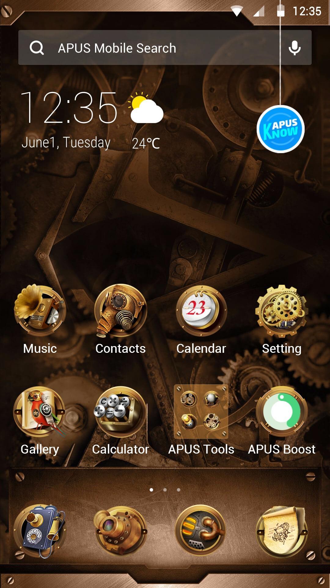 1. Nostalgic Steampunk Fashion-APUS Launcher theme is free, but only compatible with APUS Launcher. If you want to apply it, please install APUS Launcher on your Android phone. Or download new theme and APUS Launcher. When you install APUS Launcher, there are variety of themes in APUS theme & wallpaper shop, such as phonex, lovely unicorn, pink diamond mickey, Red heart, luxury, gold, business, black, simple, magic, comic, football, basketball, cricket, Valentine's Day, New Year, Halloween, Christmas, cute cat and dog, butterfly, dawn theme. Install APUS launcher to enjoy more themes.