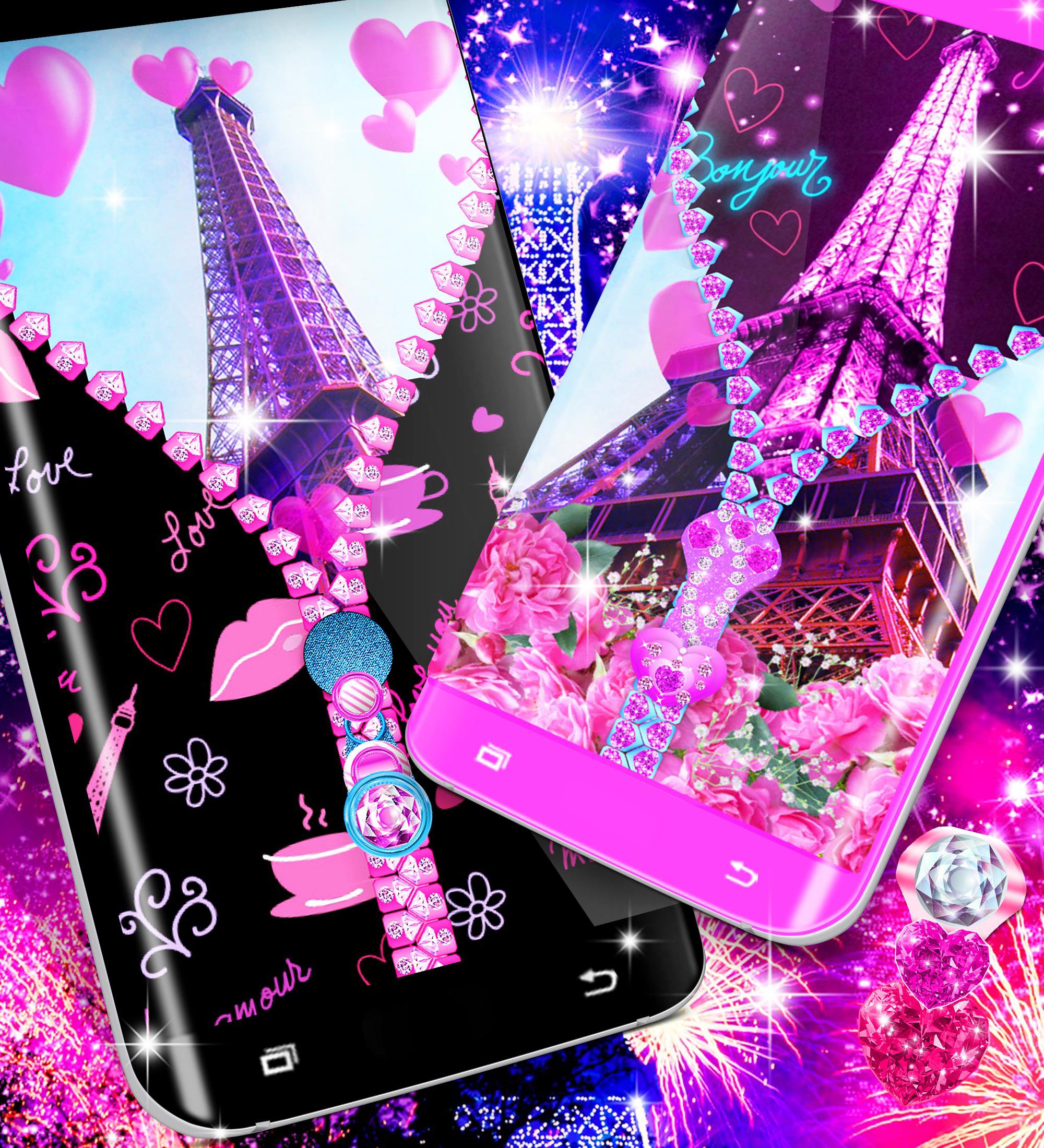 Paris zipper lock screen is a classic lock screen for android phones that unlocks using a zipper. Just drag down the zipper and the magic will happen.Choose a eiffel tower wallpaper with cute pink zipper or blue with diamond heart shaped row.Make your lock screen cool with unique eiffel tower and paris wallpapers!