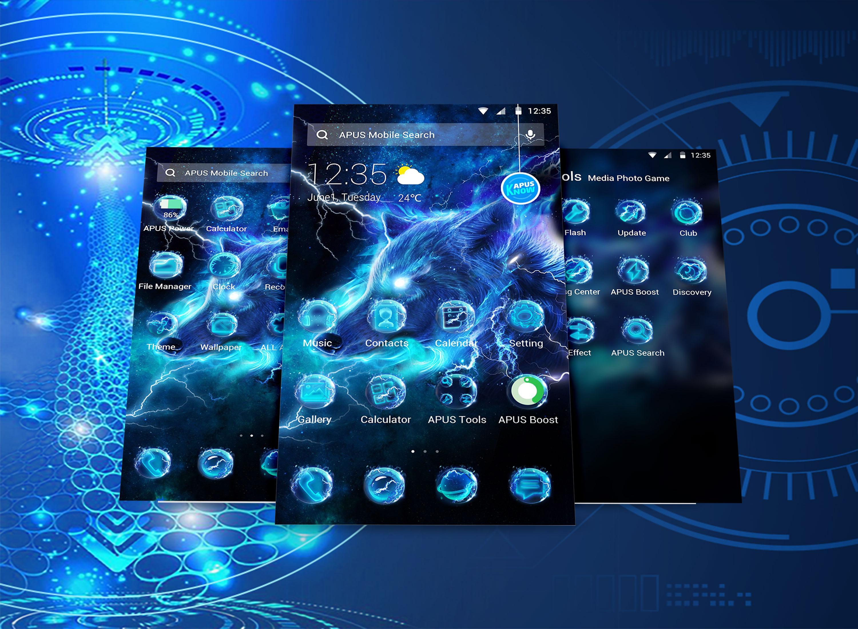 Starlight Galaxy Ice Wolf APUS Launcher theme, in the darkness of the midnight forest, emitting a blue flame of the legendary blue wolf, full moon howl, cool lightning blue texture icon with a midnight forest Blue Wolf Wallpaper, this is the theme skin of the blue flame we have prepared for you.