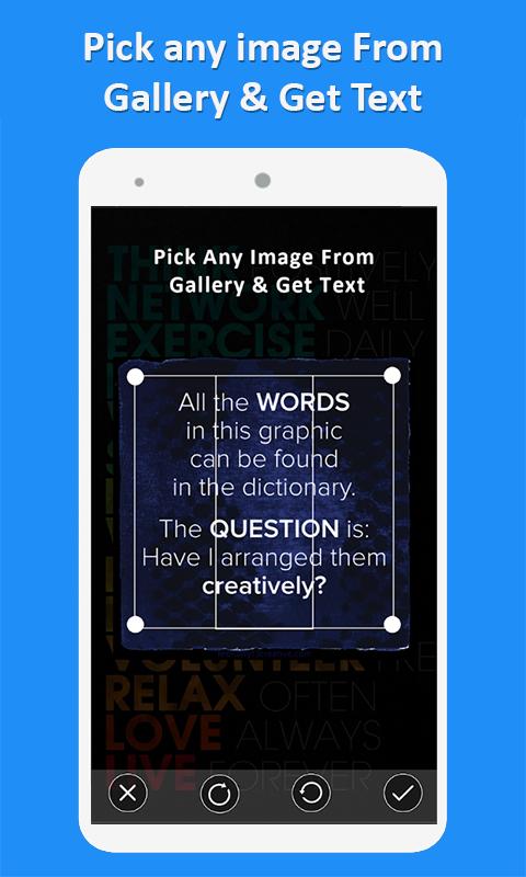 Image to text converter: Text Scanner is the best Text Scanner [OCR]: new image translator app and image to text converter app. This is a fast and text scanner and translator application that will scan text that can later be used either by sending via email, sharing on social media or you can also copy the text in clipboard for later use in any of other apps in your device.