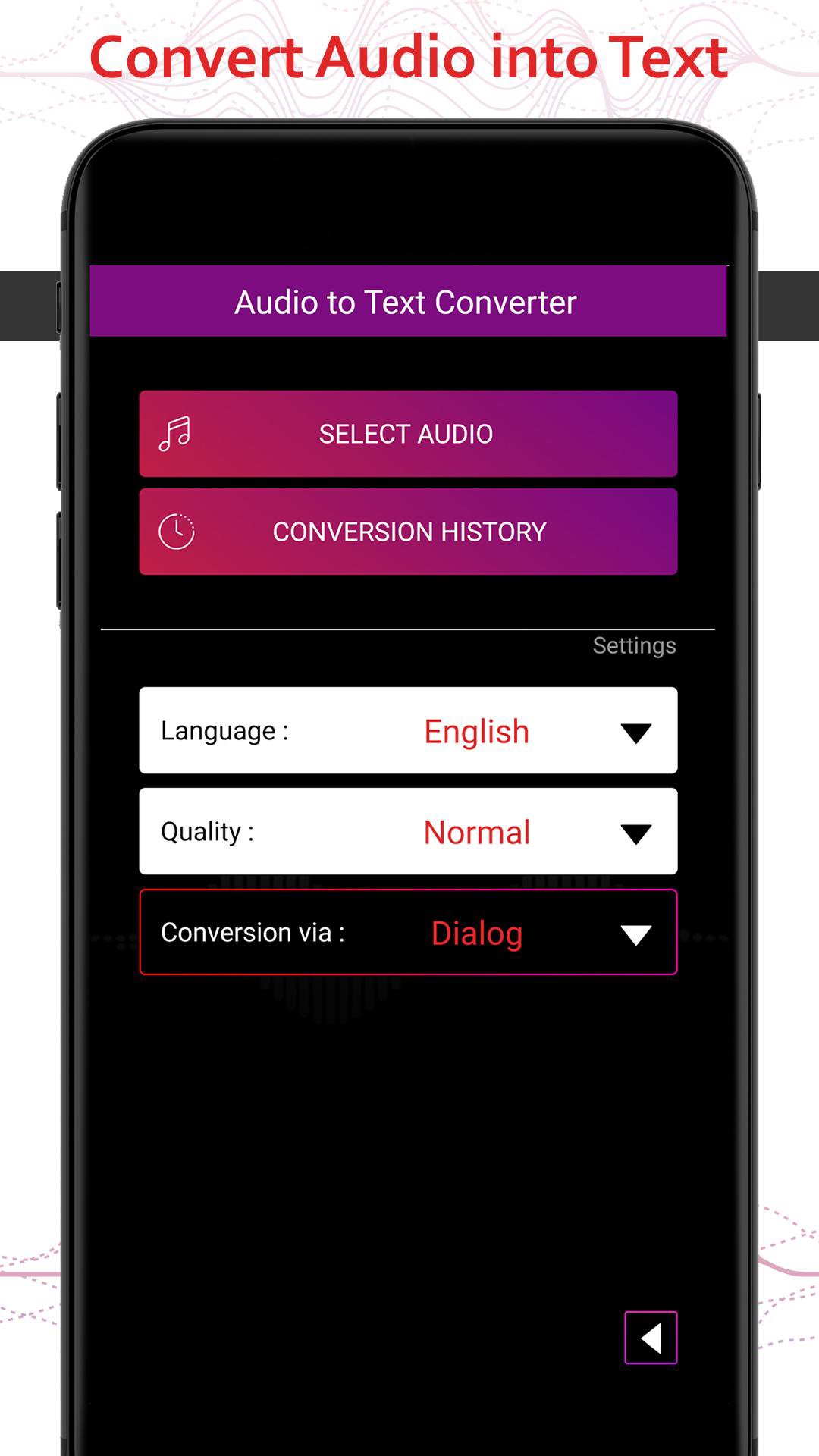 Audio To Textapp provide user to get their Audio to text form. Now, with 'Audio to Text' you can convert voice note to text accurately! It converts audio from all applications. Easily translate audio to text within some time with all new Audio to Text Android app. You can also use as speech to text app, just record voice and translate to text.