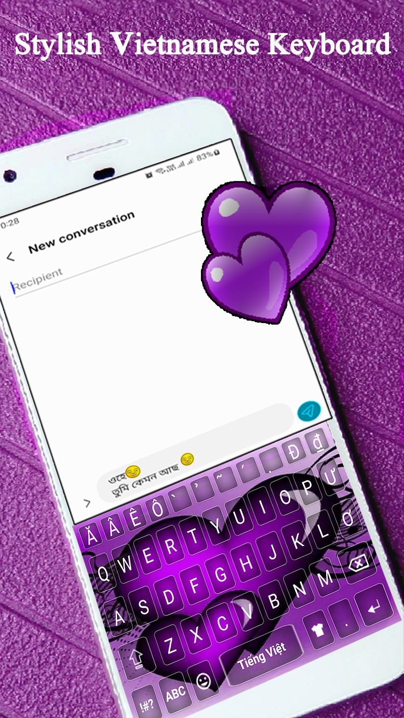 Vietnamese Keyboard is our new mobile keyboard for Android, created just for stylish keyboard lover! Our Vietnamese Keyboard will completely change the way you type your Vietnamese text messages in the Vietnamese language. Vietnamese font Keyboard is a two- Vietnamese language keyboard English and Vietnamese language, Vietnamese keyboard with cool Vietnamese fonts, Stylish Keyboard themes, Emojis and autocorrects input and word predictions. Install Fast Typing Vietnamese Keyboard now and start enjoying its awesome features and unique designs! Don't forget to share this fancy Vietnamese Language keyboard with your friends, so they can have more fun with their phones too.