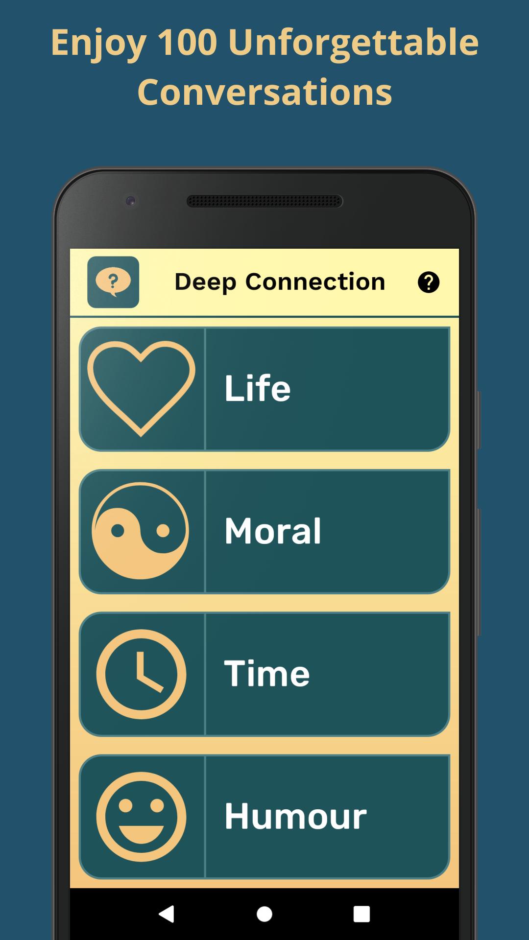 Then Deep Connection is a perfect answer. This game was created with your help and tested with couples. This ensures that the app has the best possible questions and categories.