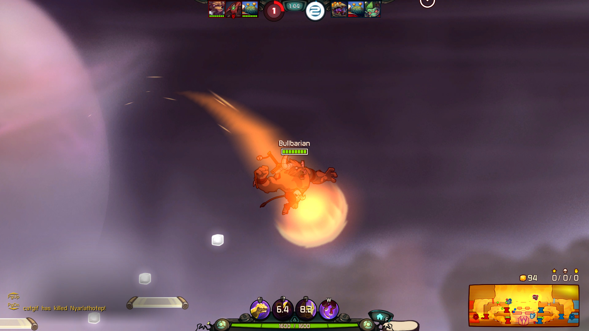 But hark! Here rises the Bullbarian from his long slumber! Having dined on raw meat and spiced milk, he sets off into the wild yonder. Kings beg for his services, witches tremble in his wake and gladiators shake with fear as he approaches. Now, he finds himself with a stranger crew still as a band of Awesomenauts have plucked him from the mists of his bygone era.