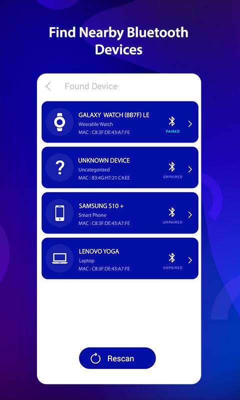 Scan all type of Bluetooth base devices like headphone, smart watches, earbuds, Bluetooth speaker, other mobile phones, etc, through our app easily.