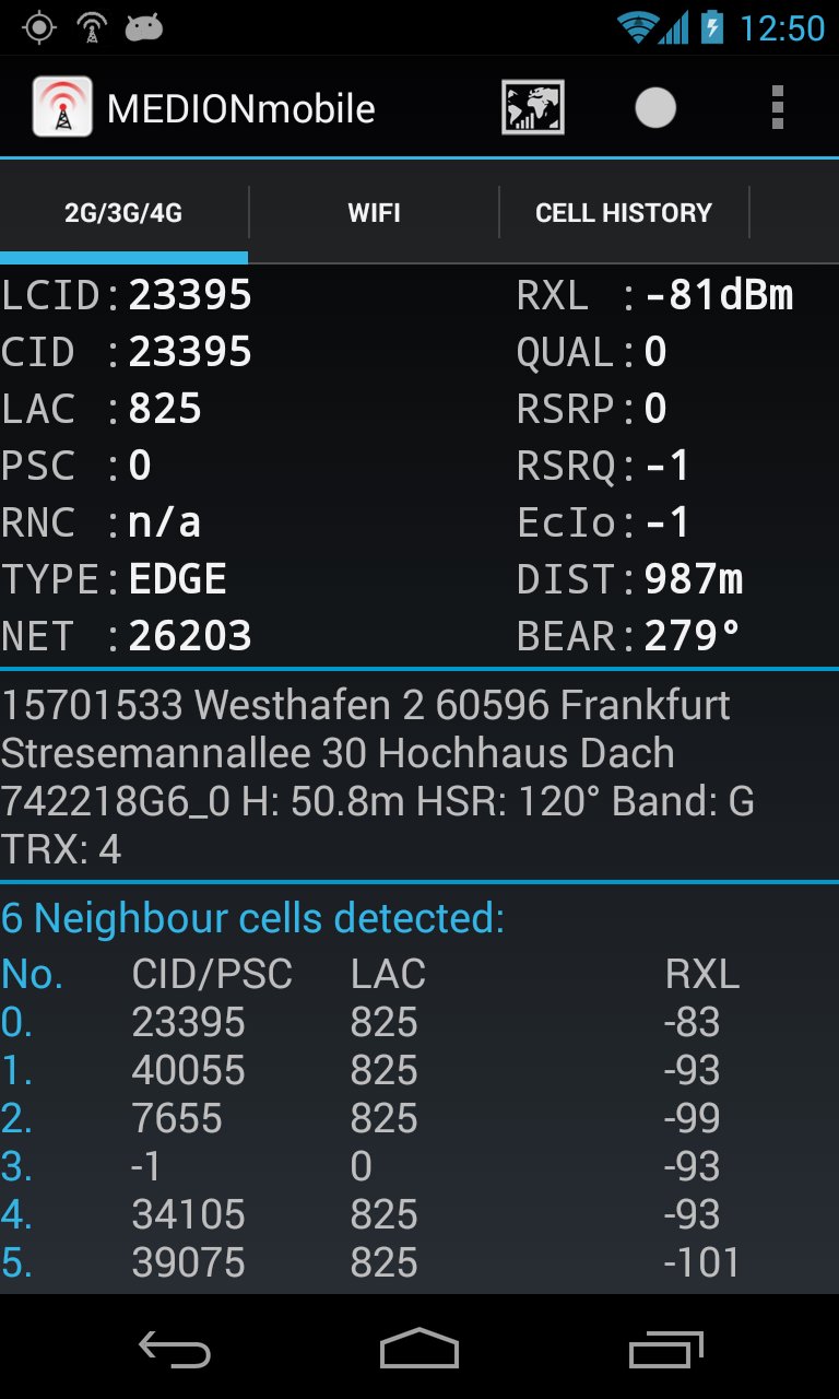 You can log GSM or UMTS RX levels into a kml file for Google Earth or a csv file. There are 5 color groups for different levels. These levels can be defined by the user in the settings menue. This file is saved into the gmon folder on the sdcard or external memory. When the log is running, the G-MoN Notification Icon changes color to red. 2G/3G logging does not work when the screen is off!