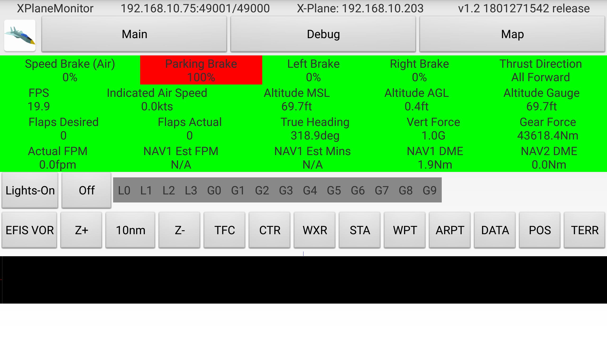 This app displays flight info about the brakes, flaps, landing gear, reverse thrust, G-forces, time and distance to NAV1, without having to look around the cockpit.
