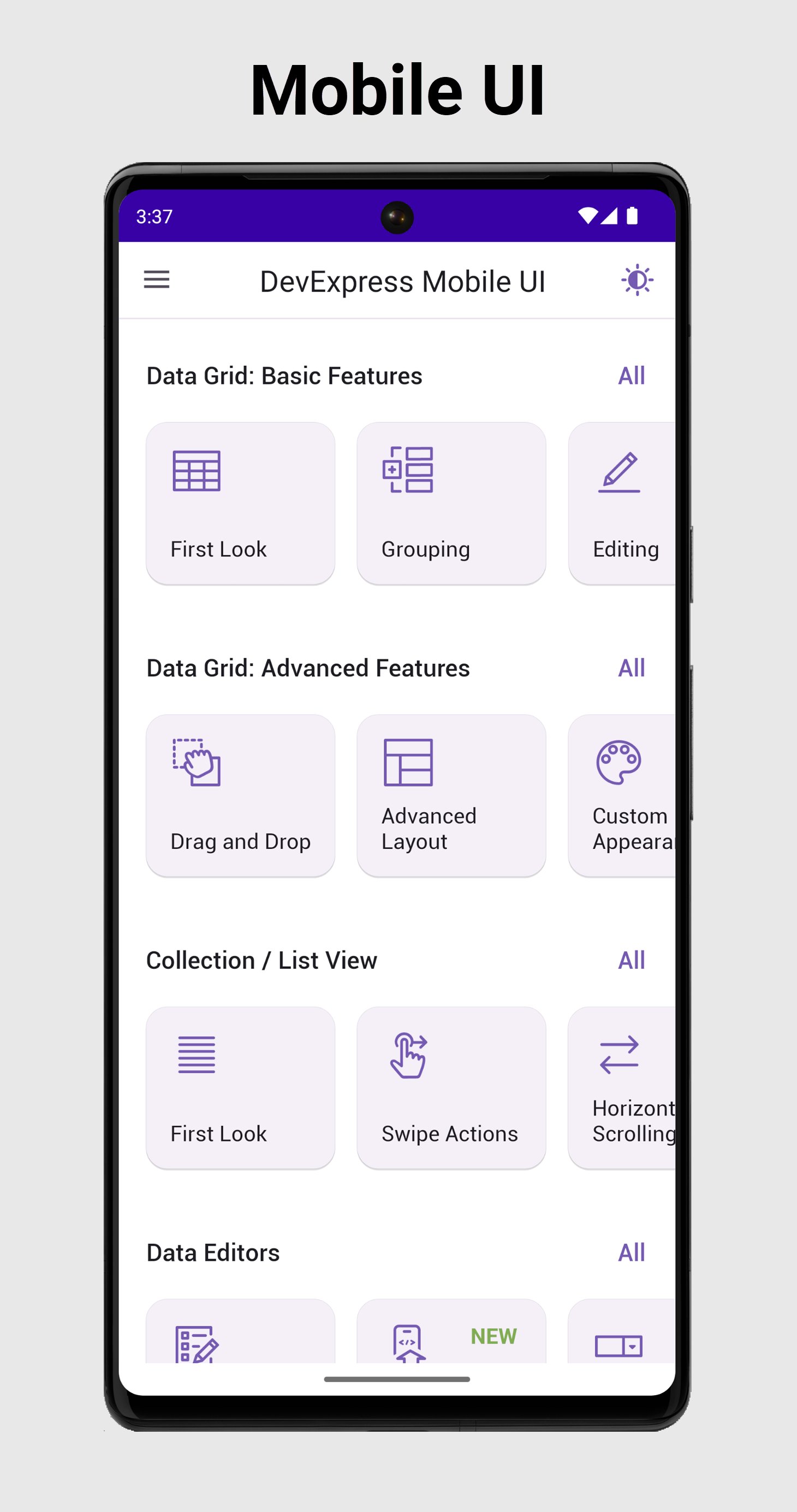 DevExpress Mobile UI ฟรีสำหรับชุดโปรแกรม .NET MAUI ประกอบด้วย Data Grid, Collection/List View, Data Editors, Popup Dialog, Data Form, Tab View, Charts, and Scheduler controls ที่ช่วยให้คุณแสดงภาพและจัดรูปแบบข้อมูลได้อย่างง่ายดาย - แอปพลิเคชั่นสมาร์ทโฟนหรือแท็บเล็ตแพลตฟอร์ม การควบคุมทั้งหมดสร้างขึ้นจากองค์ประกอบดั้งเดิมของ Android เพื่อให้แน่ใจว่าแอปพลิเคชันมีประสิทธิภาพสูงสุด แม้ว่าธีมที่กำหนดไว้ล่วงหน้าสองธีมจะให้คุณสลับระหว่างโหมดมืดและสว่างได้ คุณยังสามารถปรับแต่งรูปลักษณ์ของการควบคุมแต่ละรายการได้ตามต้องการ