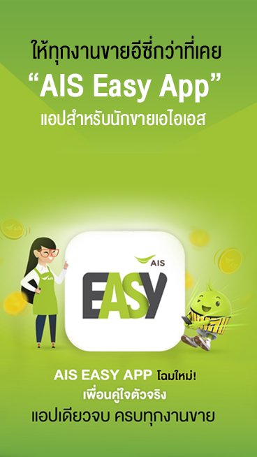 AIS Easy App แอปเดียวจบ ครบทุกงานขาย แอปพลิเคชันสำหรับเอไอเอสพาร์ทเนอร์ และ นักขายเอไอเอส ที่จะช่วยให้การขายของท่านสะดวก ตอบโจทย์งานขายงานบริการและการทำธุรกรรมด้วย Concept ง่าย,สะดวก,รวดเร็ว,ไม่ยุ่งยากไม่ต้องส่งเอกสาร ในรูปแบบ Digital Service