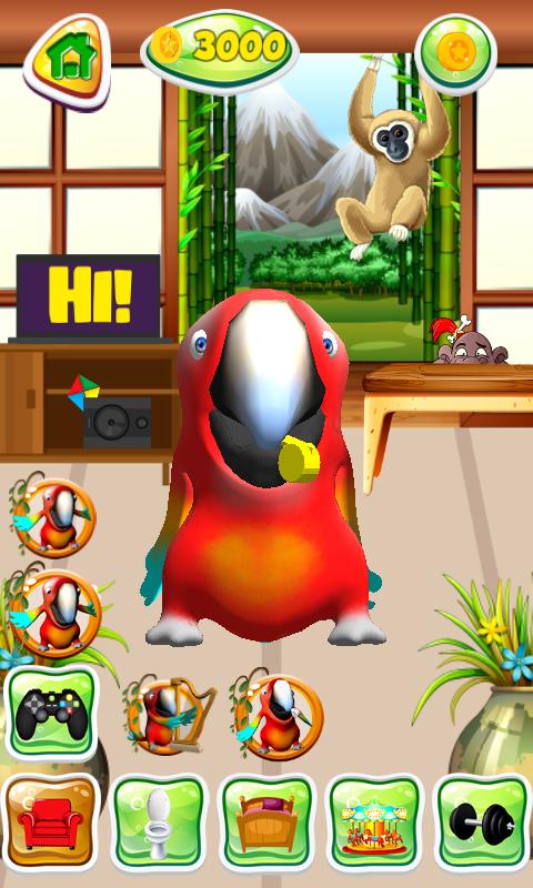 Your new virtual pet is always up for some fun, so do not forget to play with him on the playground! The ball is his favourite toy and he loves jumping on a trampoline! See liana and jungle boy will surprise you. He is very agile and good jumper. Take your virtual pet to the gym, he has a treadmill where he can run or walk. Give him weights and watch him exercise and brings into shape. Staying fit and regularly training are top priorities for this little parrot! The best talking game is perfect for kids of all ages, so do not hesitate and download it on your smartphone free of charge. The cute little parrot can dance, and he will show you some of his moves! You can tickle and slap him for fun, and see his reactions. He lives in a big house which has many wonderful rooms with interesting items. Come into his living room, open the drawer and kites will fly and colorful fireworks will delight you. You can tap the table to see the caveman who is hiding there! Tap the crazy monkey behind the window and see what happens. He is swinging on a tree branch and trying to attract your attention. Do you know that your little hero has musical talent? You will enjoy the music he performs on a harp. He also has a whistle, so get ready for a good time with your cute pet. The parrot has a bedroom where he can sleep and a cool party rool whistle wakes him up in the morning. He owns a bathroom where he can take a bath and brush his teeth and prepare for a new day. You and the parrot will have so much fun together. Help your colorful bird to collect coins and to unlock every room. Play fantastic mini games and jump into the best adventure together. In Jumpy Parrot help him cross all platforms and try to achieve the maximum height. Open Pizza Defense and try to protect this delicious food from the attack of nasty insects such as spiders other bugs. Do not forget to keep safe butterflies and ladybugs because they will try to help you in your mission. In Parrot Smash just take a hammer and hit this birds as soon as you see them come out of the pit. Enjoy playing Parrot Jump, just tap the platform that you want your hero to jump. With this latest game, you will be able to take care of your favourite virtual pet. You can talk to the parrot, he will listen very carefully and later he will be able to repeat your exact same words.