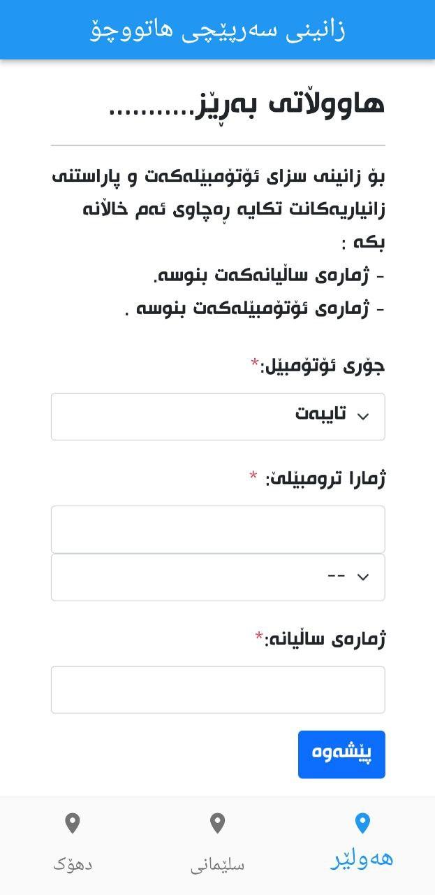 لهرێگهی ئهم (ئهپلیكهیشنهوه) دهتوانی به داخیل كردنی ژمارهی ئۆتۆمبێل و ژمارهی ساڵیانه، بڕو جۆری سهرپێچی هاتووچۆی ئۆتۆمبێلەکەت بزانی، بۆههر سێ پارێزگای ههولێر و سلێمانی و دهۆك