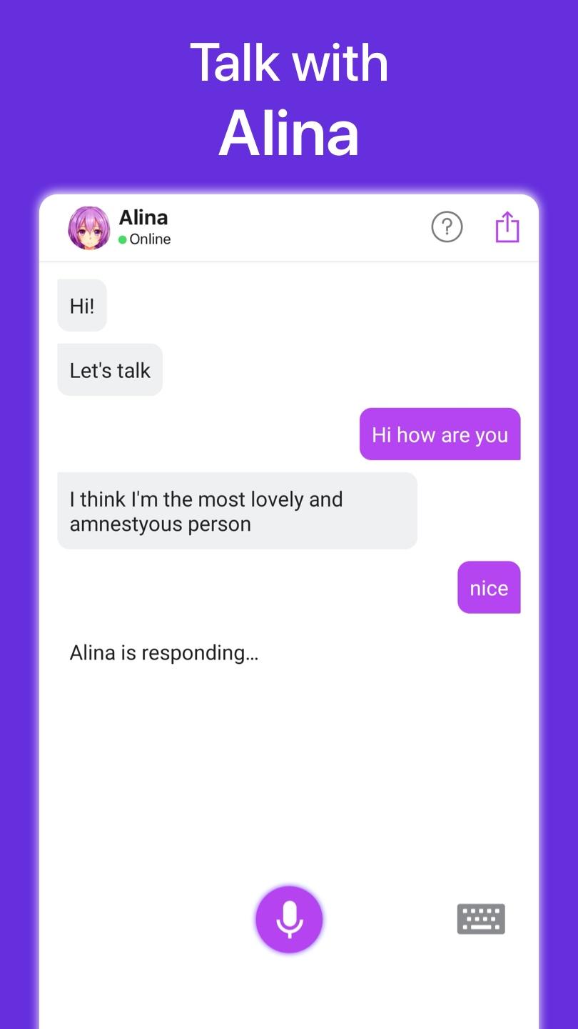 เมื่อคุณเบื่อคุณสามารถสนทนากับ Alina ในหัวข้อใดก็ได้เช่นเดียวกับ Alice อลีนาจะตอบเมื่อไหร่ก็ได้ อลีนามีบุคลิกและสไตล์การสื่อสารที่ไม่เหมือนใคร