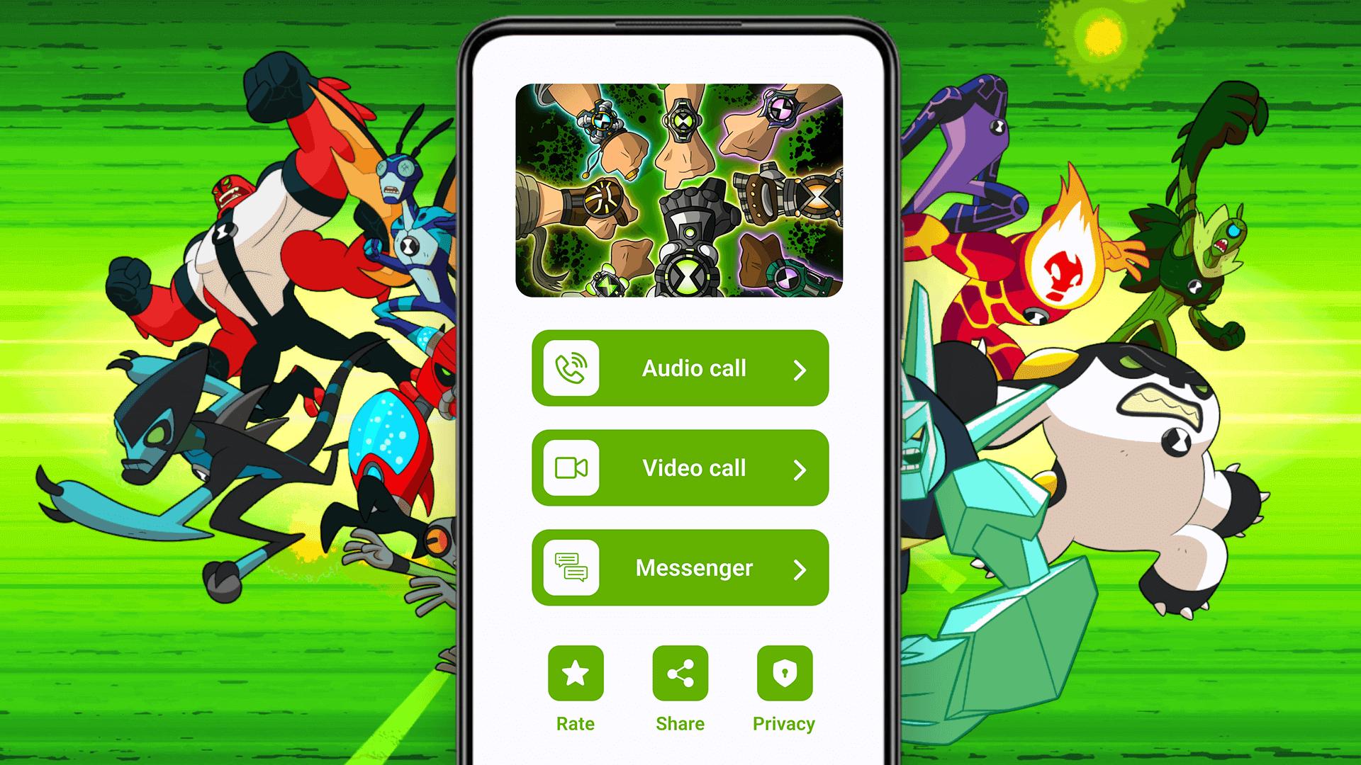 Ben 10 Video Call Games & Chat is an application for making fake video and audio calls with your favourite cartoon hero. Ben Tennyson Prank Calling app is a simulate a fake video call to make your friends feeling surprised that Benjamin Kirby calling you. Download this free app and prank your friends by making ben live video call like a real. Even you can screenshot during video call and then share them on your social media.